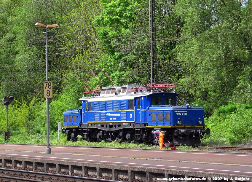 Die 1020.041 der MittelWeserBahn steht in Laufach als Schubunterstuetzung fuer private Gueterzuege bereit. Am 11. Mai 2005 ist die Lok aufgebueglt, da an ihrem Abstellplatz gearbeitet wird.