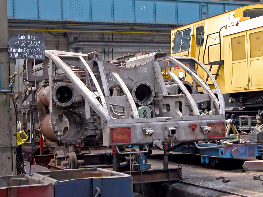 Vom Edelrenner 18 201 war der Rahmen in der großen Richthalle des Dampflokwerkes von Meinigen zu bewundern.