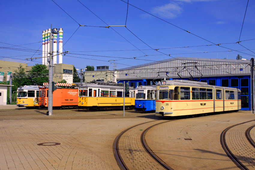 Eine kleine Parade historischer Fahrzeuge erwartete die Teilnehmer der Grimmtour im Straßenbahndepot von Gotha. von rechts nach links: TW 395, Arbeitswagen 10, TW 56, TW 10 und Gelenkwagen 215 sonnen sich im Morgenlicht.