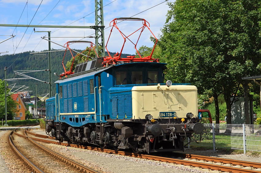 Als Ersatz für die defekte Dampflok 58 311 beförderte die als 194 178 auferstandene 194 580 den Sonderzug der UEF am 1. August 2010 durch Murgtal nach Baiersbronn. Hier beim Umsetzen im Bahnhof Baiersbronn.
