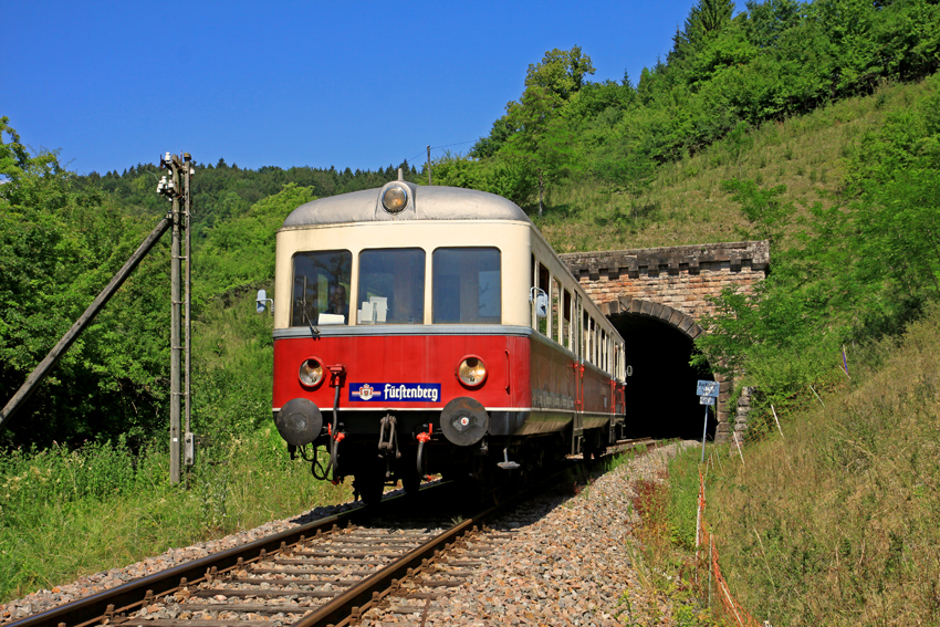 Erstes Ziel der Grimmtour 2011 war die Museumsbahn Wutachtaltal - die "Sauschwänzlebahn". Nach dem Start in Zollhaus - Blumberg (702m. ü. M.)war der erste Fotohalt gleich erfolgreich. Der extra für die Grimmtourteiulnehmer gecharterte Dieseltriebwagen VT 3 der Museumseisenbahn hat soeben den 805 m langen Buchbergtunnel verlassen.