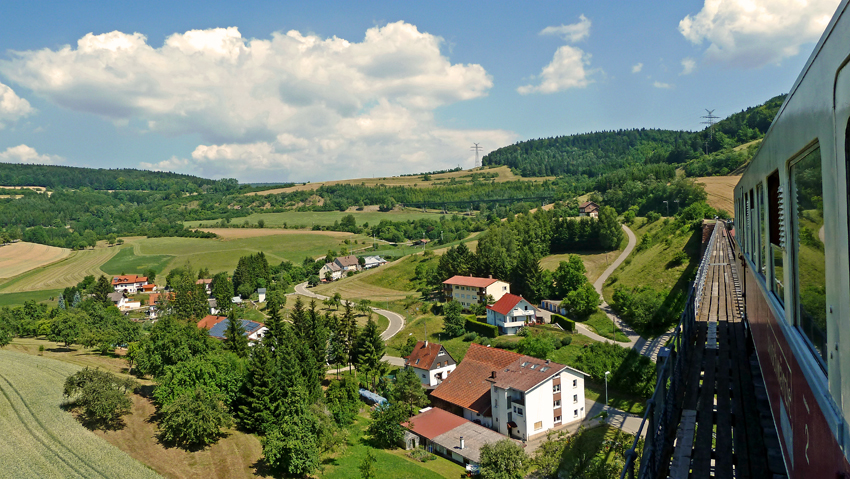 Während der Sauschwänzleexpress gerade das Epfenhofener Viadukt überquert eröffnet sich der Fotografin B. Schiele der Blick auf den Bahnhof Epfenhofen und das darüberliegende Biesenbachviadukt.