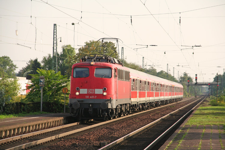 Im Jahre 2006 ein alltäglicher Gast auf der Main-Neckar-Bahn war die Baureihe 110 vor Personenzügen. Mit Ziel Frankfurt war die 110 401 unterwegs. Der Fotograf stand an südlichen Einfahrt von Bensheim-Auerbach.