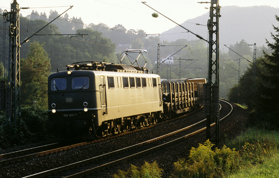 An einem Septemberabend im Jahre 1988 zieht die grüne 150 iger ihren Gueterzug Richtung Heilbronn. Soeben hat sie den Neckar bei Neckargemuend ueberquert.