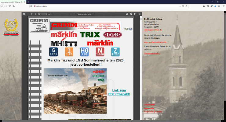 Joachim Grimm Grabengasse 7 69469 Weinheim T: 06201 – 12775 info@grimmtrain.de Gerne begrüßen wir Sie auch auf der Hompage der Firma Modellbahn-Grimm Alle Newsletter der Firma Modellbahn-Grimm finden Sie in ihrem